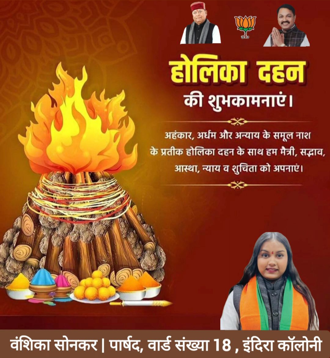 देहरादून। युवा भाजपा नेत्री, प्रसिद्ध समाज सेवी एवं वार्ड संख्या 18, इंदिरा कॉलोनी की नगर निगम पार्षद वंशिका सोनकर ने ‘होलिका दहन’ के शुभ अवसर पर समस्त देशवासियों को हार्दिक बधाई एवं शुभकामनाएं दी हैं।