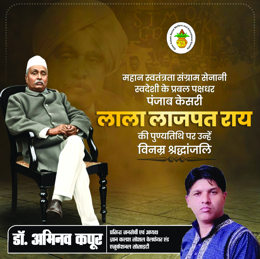 देहरादून। प्रसिद्ध जनसेवी, विख्यात शिक्षक, ज्ञान कलश सोशल वेलफेयर एंड एजुकेशनल सोसाइटी के अध्यक्ष एवं शिक्षा रत्न की उपाधि से सम्मानित डॉ. अभिनव कपूर ने महान स्वतंत्रता सेनानी लाला लाजपत राय की पुण्यतिथि पर उन्हें श्रद्धासुमन अर्पित करते हुए सादर नमन किया।