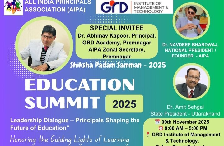 इस एजुकेशन समिट का आयोजन ऑल इंडिया प्रिंसिपल्स एसोसिएशन (एआईपीए) एवं जीआरडी इंस्टीट्यूट ऑफ मैनेजमेंट एंड टेक्नोलॉजी के द्वारा संयुक्त रूप से किया जा रहा है।