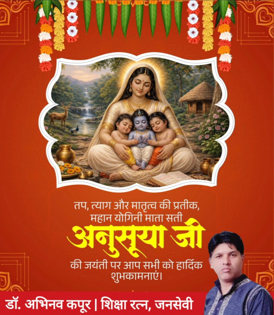 इस अवसर पर जारी अपने संदेश में शिक्षा रत्न डॉ. अभिनव कपूर ने कहा- तप, त्याग और मातृत्व की प्रतीक, महान योगिनी माता सती अनुसूया जी की जयंती पर आप सभी को हार्दिक बधाई एवं शुभकामनाएं।