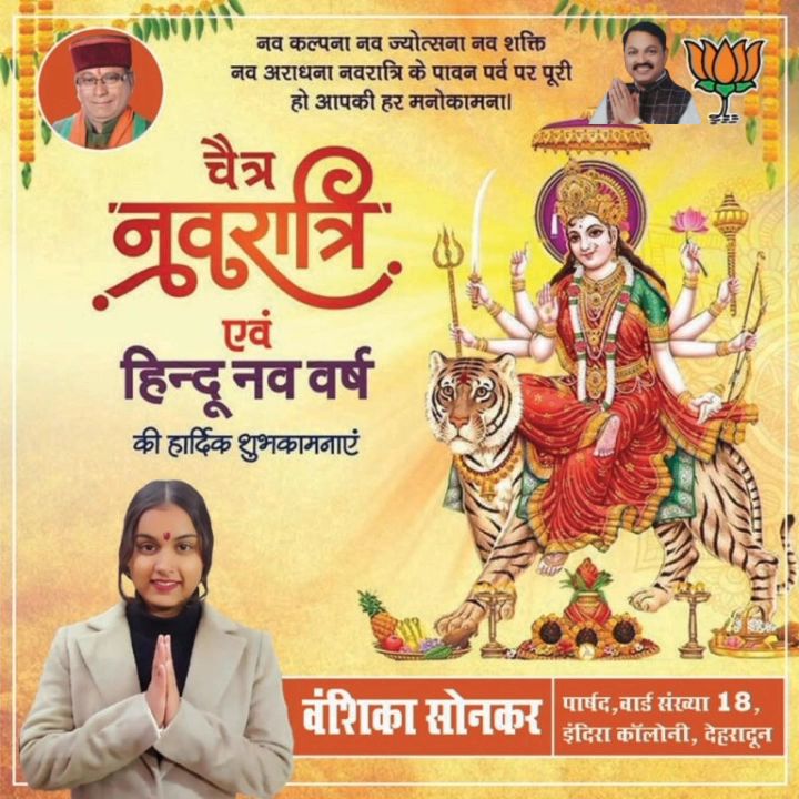 देहरादून। युवा भाजपा नेत्री, प्रसिद्ध समाज सेवी एवं वार्ड संख्या 18 इंदिरा कॉलोनी की नगर निगम पार्षद वंशिका सोनकर ने समस्त देशवासियों को चैत्र नवरात्रि एवं हिन्दू नववर्ष (विक्रमी संवत 2083) के पावन अवसर पर हार्दिक बधाई एवं शुभकामनाएं दी हैं।