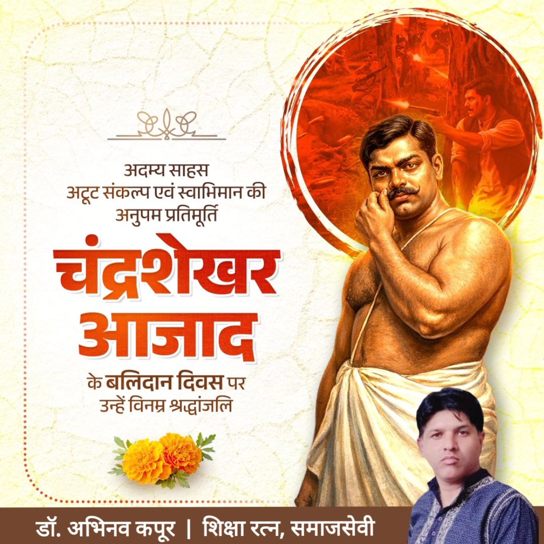 इस अवसर पर जारी अपने संदेश में शिक्षा रत्न डॉ. अभिनव कपूर ने कहा- वीरता और साहस के पर्याय, महान स्वतंत्रता सेनानी, अमर शहीद चन्द्रशेखर आजाद जी की पुण्यतिथि पर उन्हें विनम्र श्रद्धांजलि एवं शत्-शत् नमन।