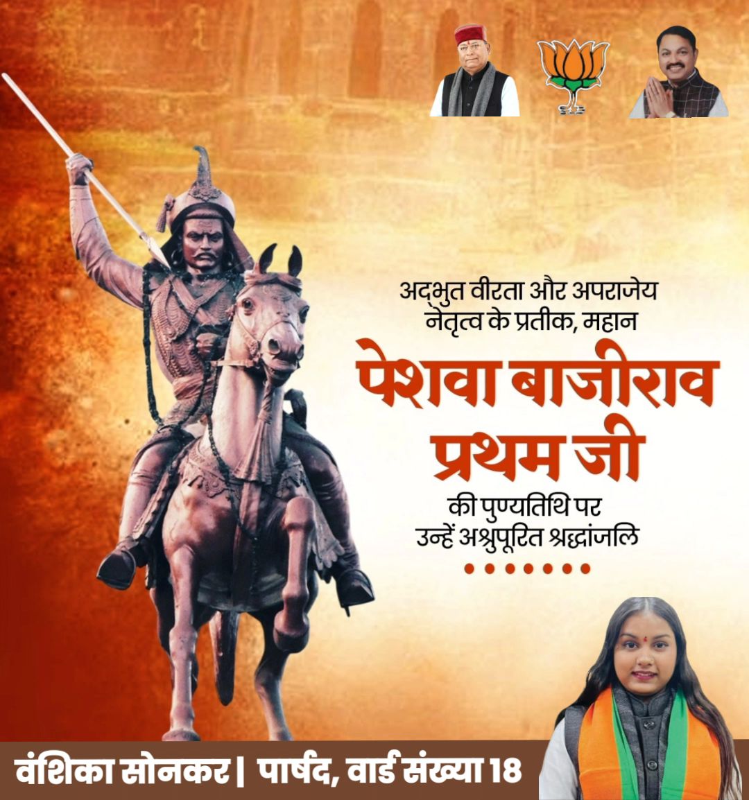 इस अवसर पर जारी अपने संदेश में युवा भाजपा नेत्री वंशिका सोनकर ने कहा- अप्रतिम वीरता के प्रतीक एवं मराठा साम्राज्य के गौरव पेशवा बाजीराव प्रथम जी की पुण्यतिथि पर उन्हें विनम्र श्रद्धांजलि एवं कोटि-कोटि नमन। पेशवा बाजीराव प्रथम जी की अद्वितीय युद्धनीति, नेतृत्व क्षमता और मातृभूमि के प्रति अटूट समर्पण ने भारतीय इतिहास में वीरता और रणनीति का स्वर्णिम अध्याय रचा, जो आज भी हम सभी के सामने साहस, स्वाभिमान और कर्तव्यनिष्ठा का आदर्श प्रस्तुत करता है।