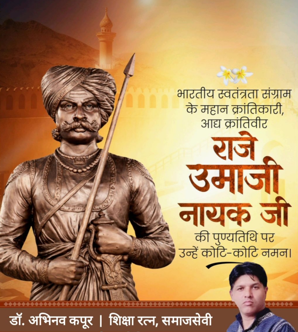 जनसेवी डॉ. अभिनव कपूर ने कहा- ब्रिटिश शासन के खिलाफ सशस्त्र संघर्ष शुरू करने वाले पहले क्रांतिकारी नरवीर राजे उमाजी नाइक जी के बलिदान दिवस पर उन्हें विनम्र श्रद्धांजलि। माँ भारती को ग़ुलामी की जंजीरों से आज़ाद करवाने हेतु उनके संघर्ष, महत्वपूर्ण योगदान एवं सर्वोच्च बलिदान को देश कभी भुला नहीं पाएगा।