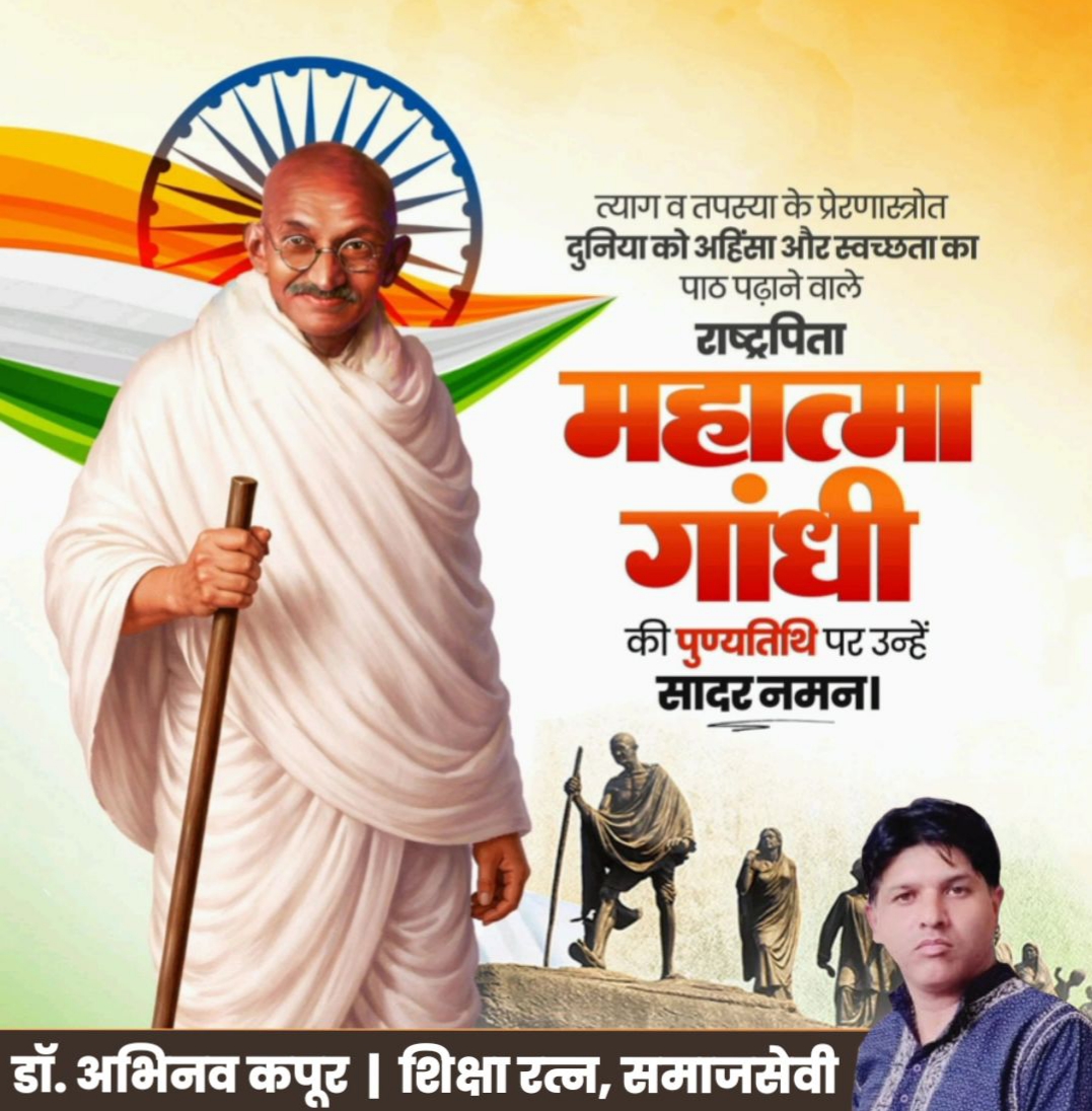 शिक्षा रत्न डॉ. अभिनव कपूर ने राष्ट्रपिता महात्मा गाँधी की पुण्यतिथि पर उन्हें भावपूर्ण श्रद्धाजंली देते हुए कहा- आइए, ‘बापू’ के आदर्शों को आत्मसात कर समृद्ध, न्यायपूर्ण और विकसित भारत के निर्माण में अपना श्रेष्ठ योगदान दें।