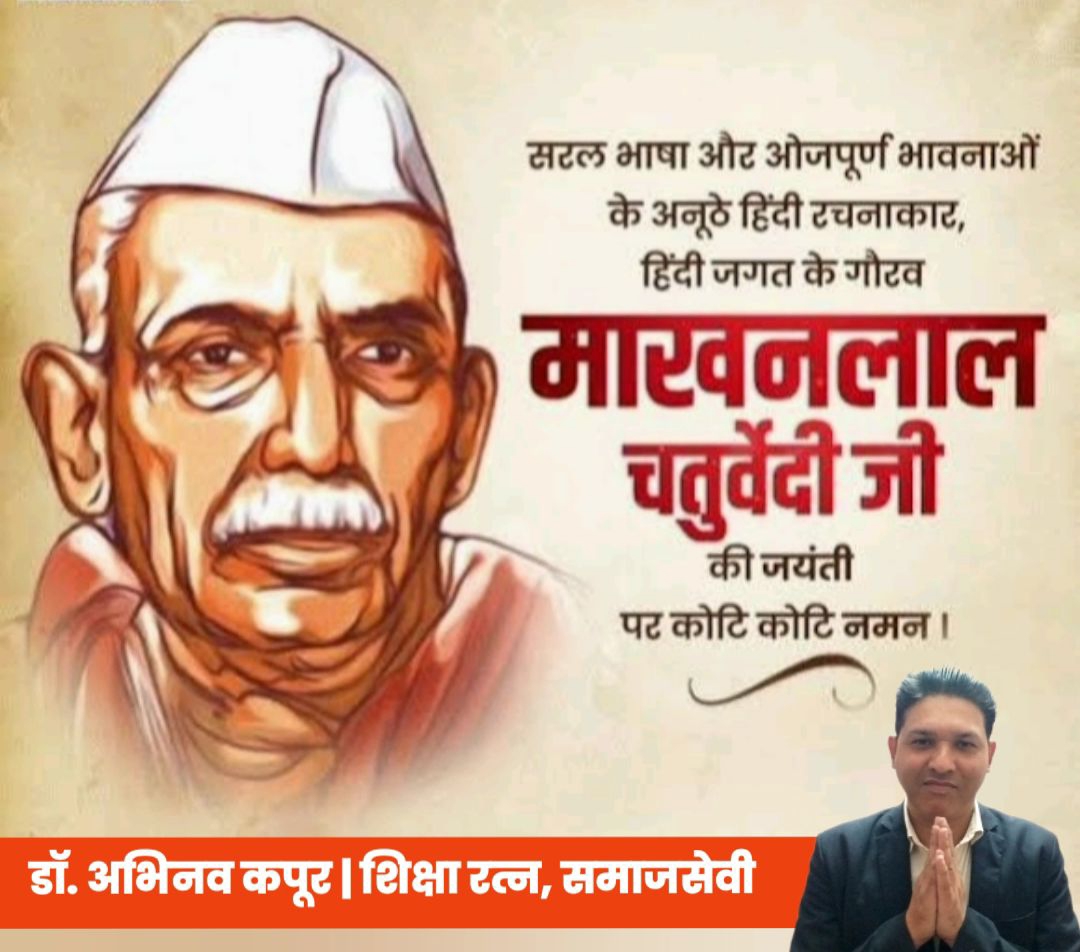 डॉ. अभिनव कपूर ने कहा- भारतीय चेतना के स्वर, शब्दों में राष्ट्र बसाने वाले महान कवि, लेखक और पत्रकार पंडित माखनलाल चतुर्वेदी का जीवन यह सिखाता है कि कविता केवल भाव नहीं, बल्कि देश के लिए समर्पण होती है। उनकी जयंती पर उस कलम को नमन, जिसने भारत को सोचना, जागना और स्वाभिमान से जीना सिखाया।