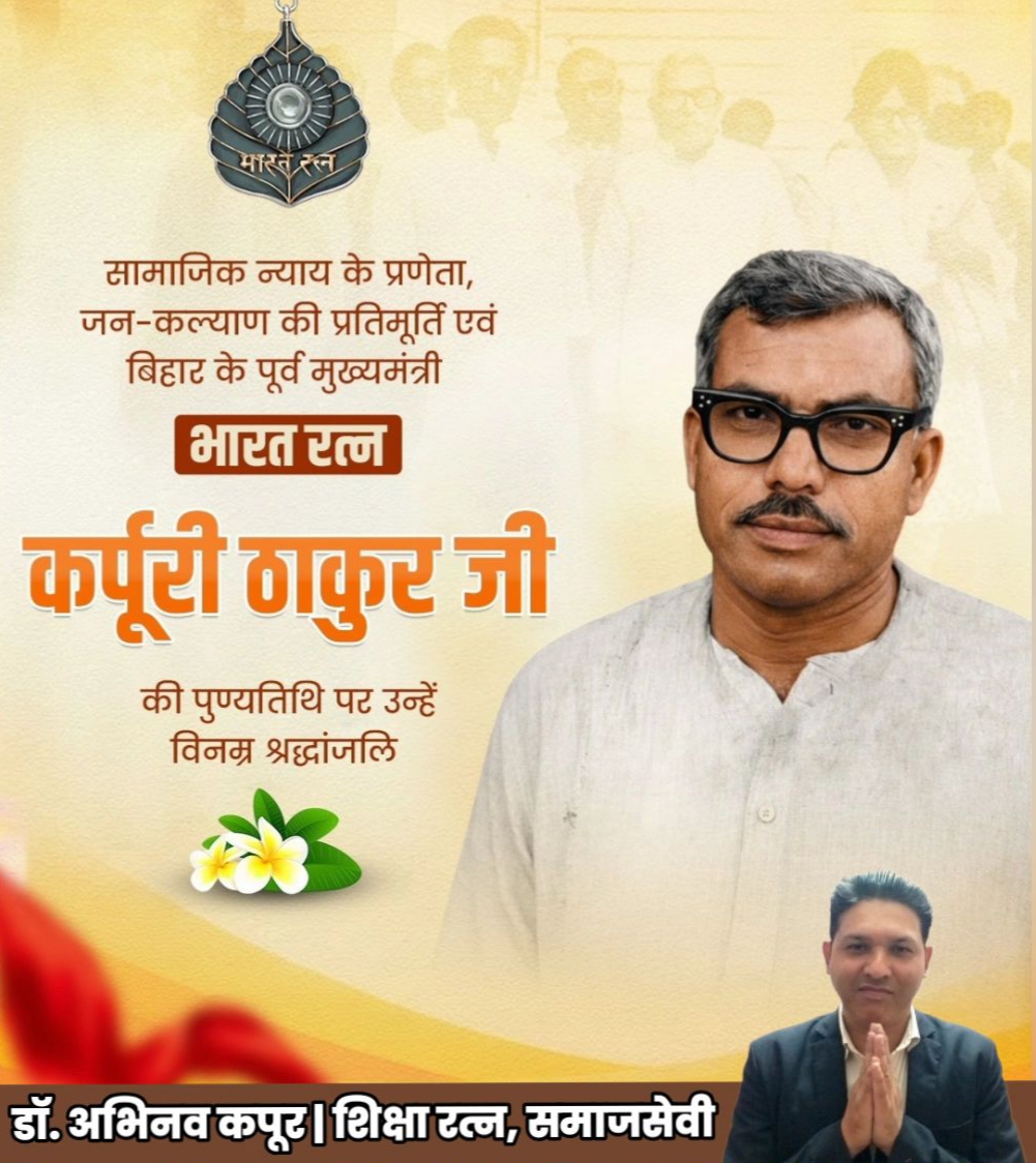 इस अवसर पर जारी अपने संदेश में शिक्षा रत्न डॉ. अभिनव कपूर ने कहा, महान स्वतंत्रता सेनानी, सामाजिक न्याय के अग्रदूत ‘भारत रत्न’ कर्पूरी ठाकुर जी की पुण्यतिथि पर उन्हें विनम्र श्रद्धांजलि एवं कोटिशः नमन। शोषित-वंचितों के सशक्तीकरण और लोकतांत्रिक मूल्यों की रक्षा के प्रति उनकी अटूट प्रतिबद्धता सदैव प्रेरणास्पद रहेगी।
