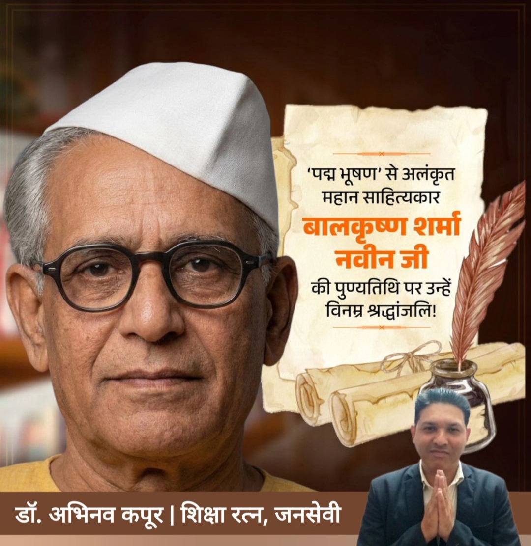 इस अवसर पर जारी अपने संदेश में शिक्षा रत्न डॉ. अभिनव कपूर ने कहा- हिंदी साहित्य के प्रतिष्ठित कवि, महान स्वतंत्रता संग्राम सेनानी एवं ‘पद्मभूषण’ से अलंकृत महान साहित्यकार बालकृष्ण शर्मा ‘नवीन’ जी की पुण्यतिथि पर उन्हें विनम्र श्रद्धांजलि एवं कोटि-कोटि नमन।